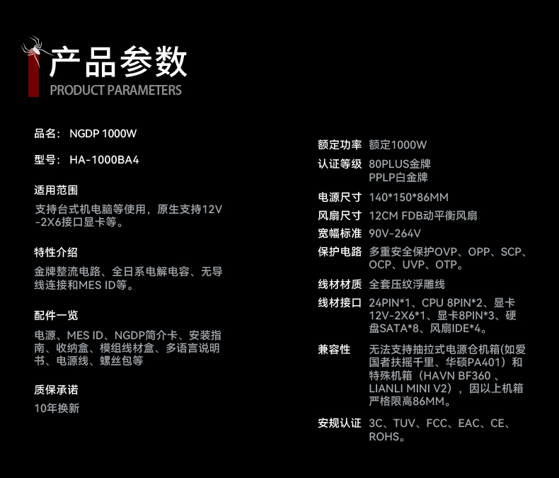 NGDP -下一代电源主宰形态有③:严守ATX3.0&3.1双规范,千瓦级但保持标准小身形和通过MES ID可查询电源体测报告。NGDP还通过了80PLUS金牌认证,采用金牌LLC整流方案,50%负载内实现零dBA体验, 各项电压保持时间皆大于22MS并且标配昂贵的全套压纹浮雕线。NGDP,壮怀激烈,忠于玩家。