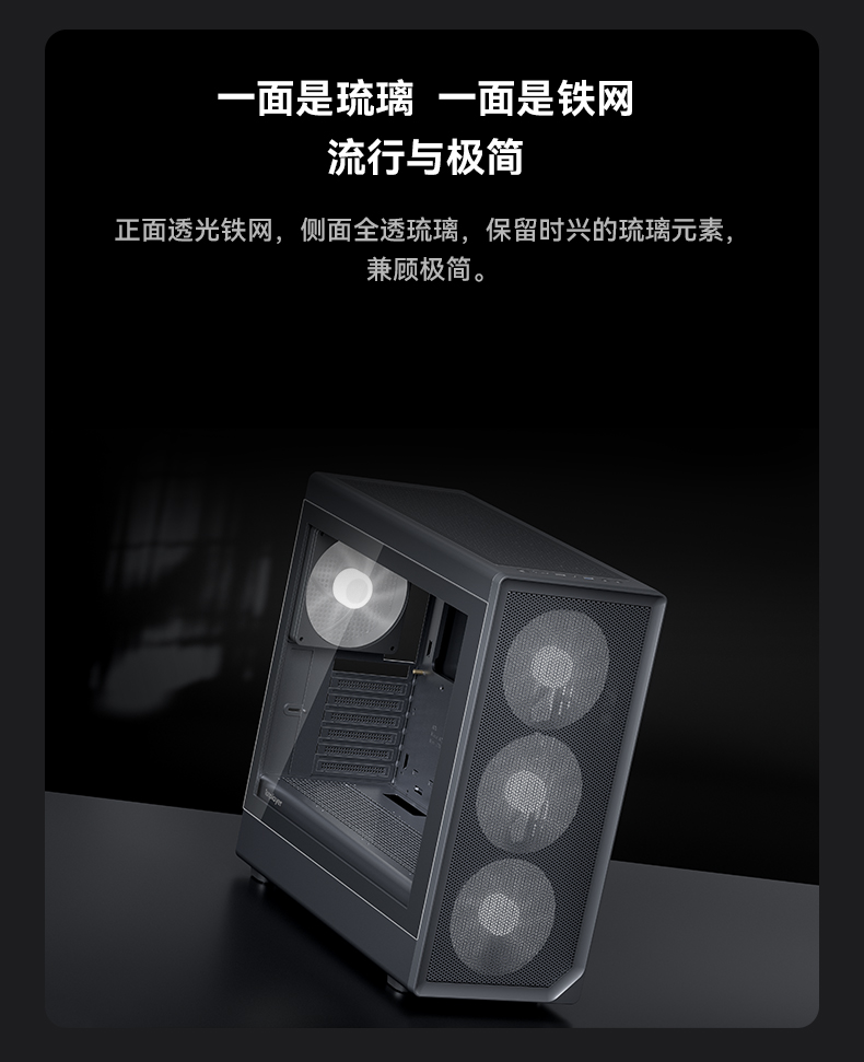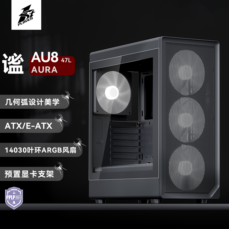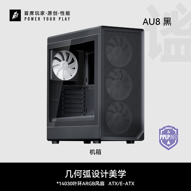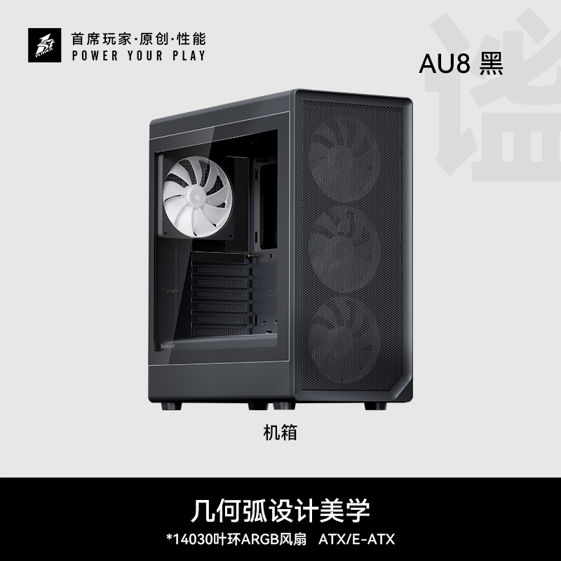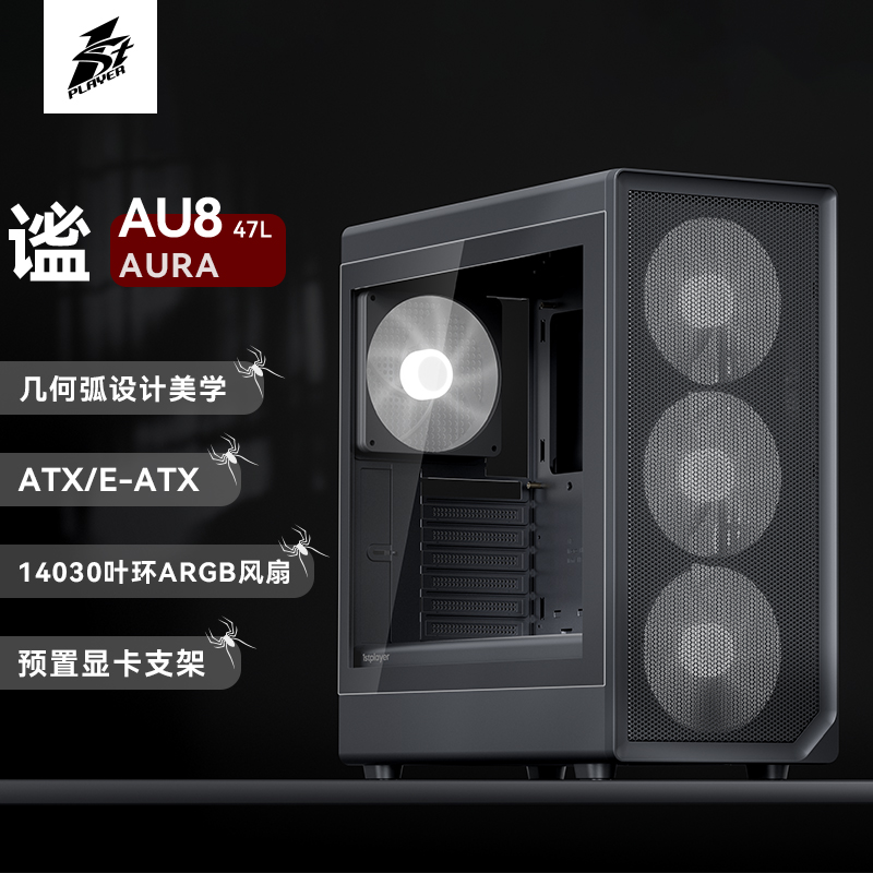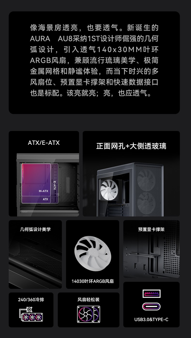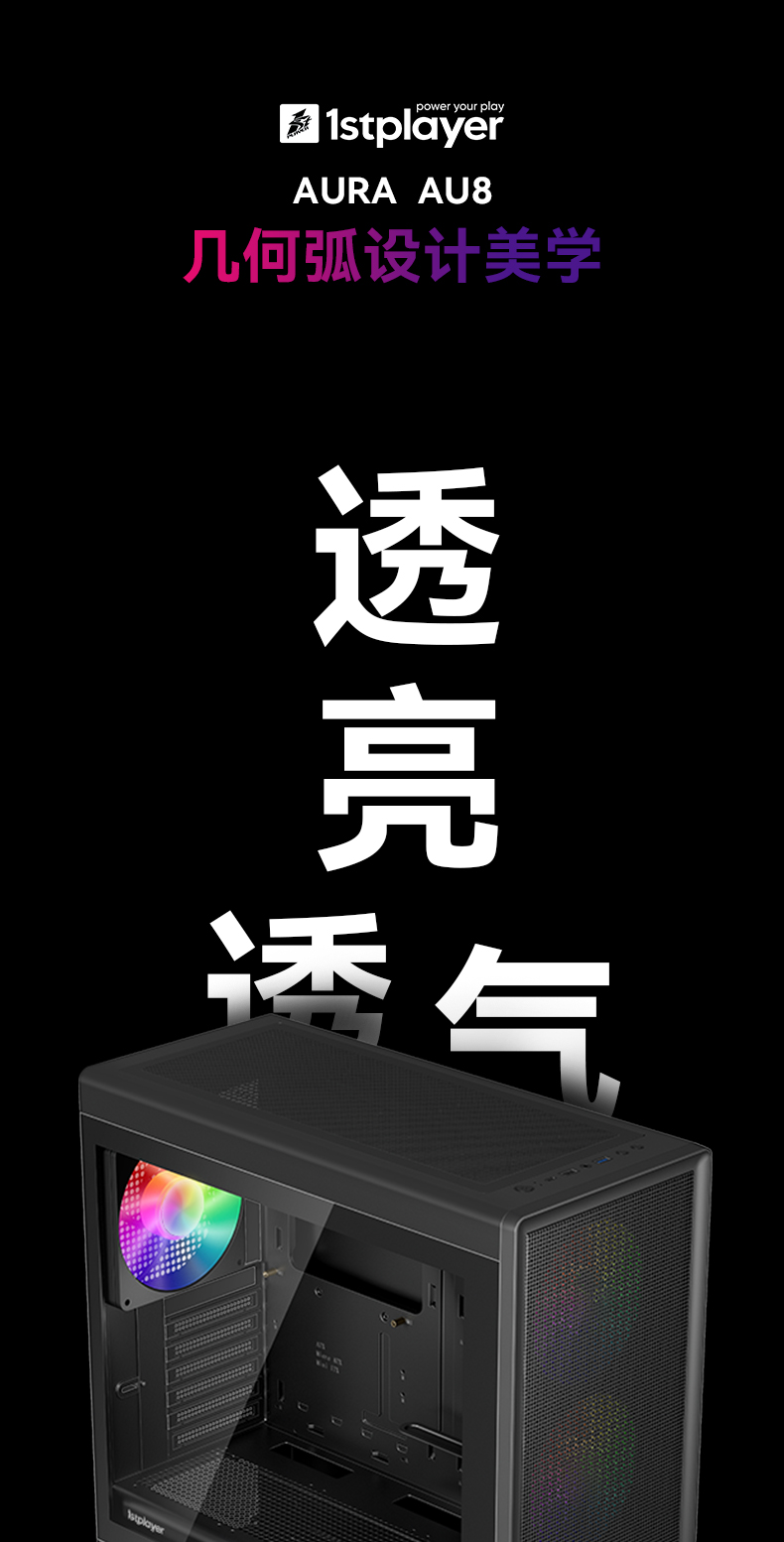 像海景房透亮,也要透气。新诞生的AURA AU8采纳1ST设计师倔强的几何弧设计,引入透气140x30MM叶环ARGB风扇,兼顾流行琉璃美学、极简金属网格和静谧体验,而当下时兴的多风扇位、预置显卡撑架和快速数据接口也是标配。该亮就亮;亮,也应透气。