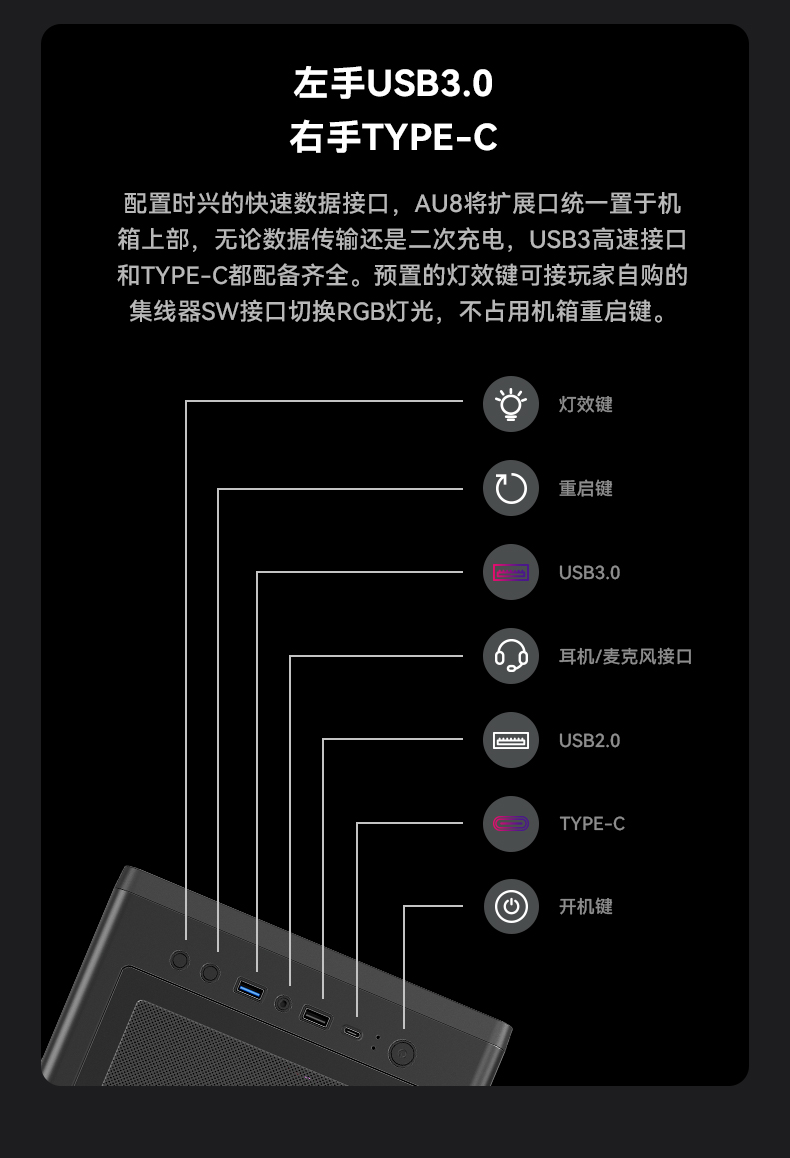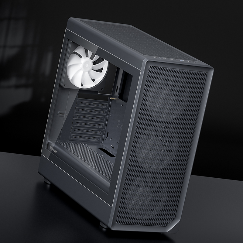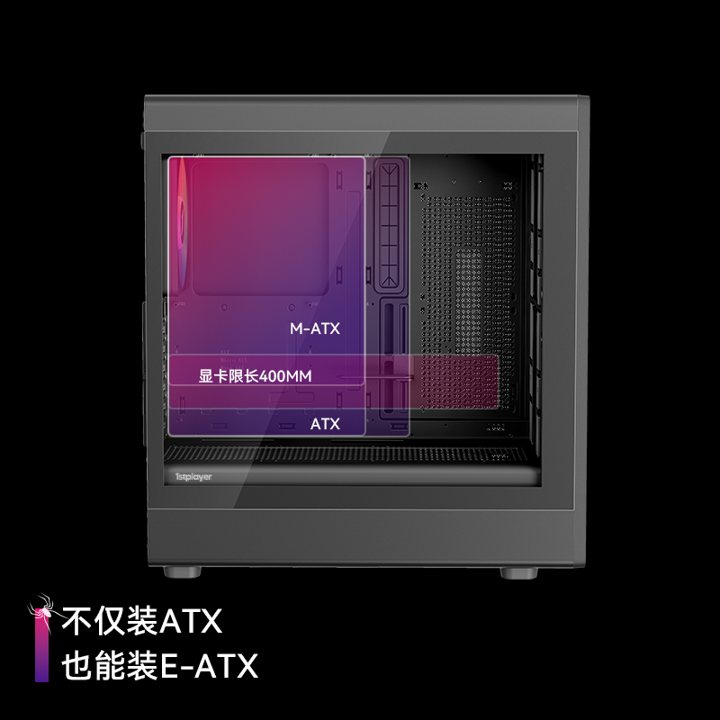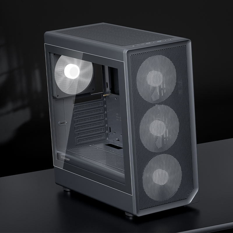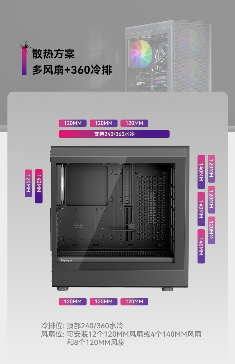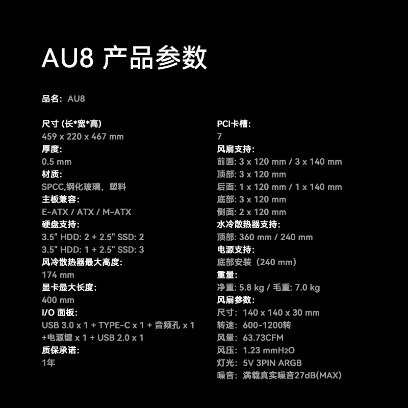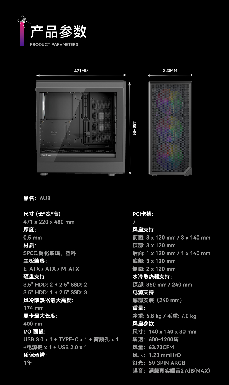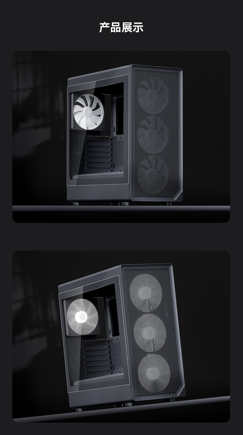 像海景房透亮,也要透气。新诞生的AURA AU8采纳1ST设计师倔强的几何弧设计,引入透气140x30MM叶环ARGB风扇,兼顾流行琉璃美学、极简金属网格和静谧体验,而当下时兴的多风扇位、预置显卡撑架和快速数据接口也是标配。该亮就亮;亮,也应透气。