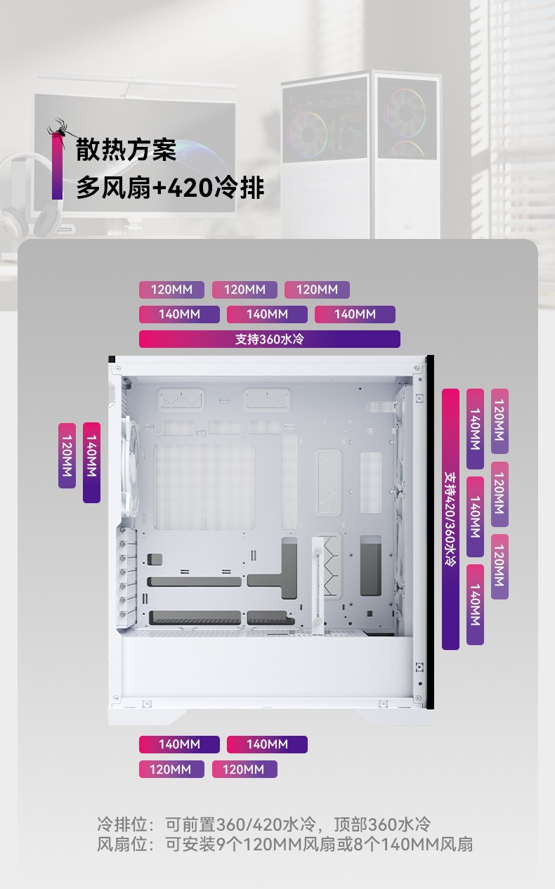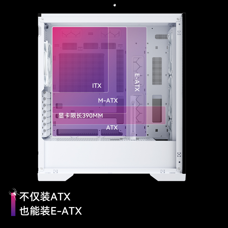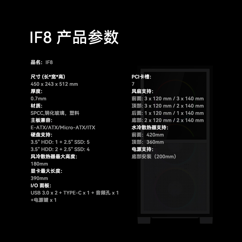 该大,就大。繁缛该省则省,空间该大就大。新诞生的INFINITY IF8来自1ST灵光一闪的互置对称美学,赋予革新的“强正吹三面进风”风道,兼顾流行的琉璃美学和金属网格散热,而当下时兴的背插、预置显卡撑架和快速数据接口也是标配。该大就大;大,也应不同。