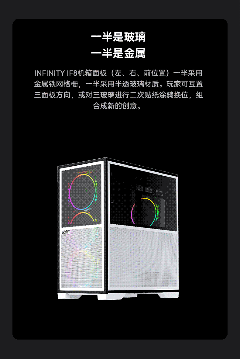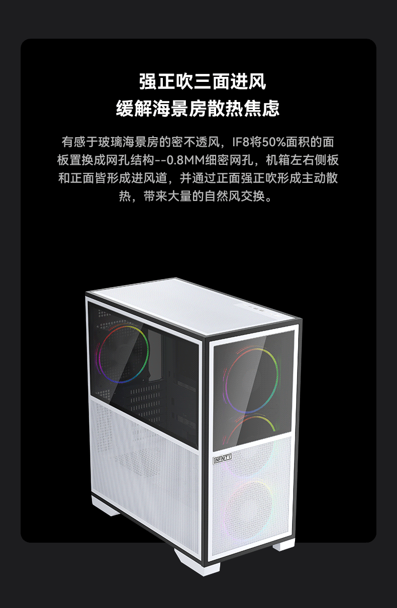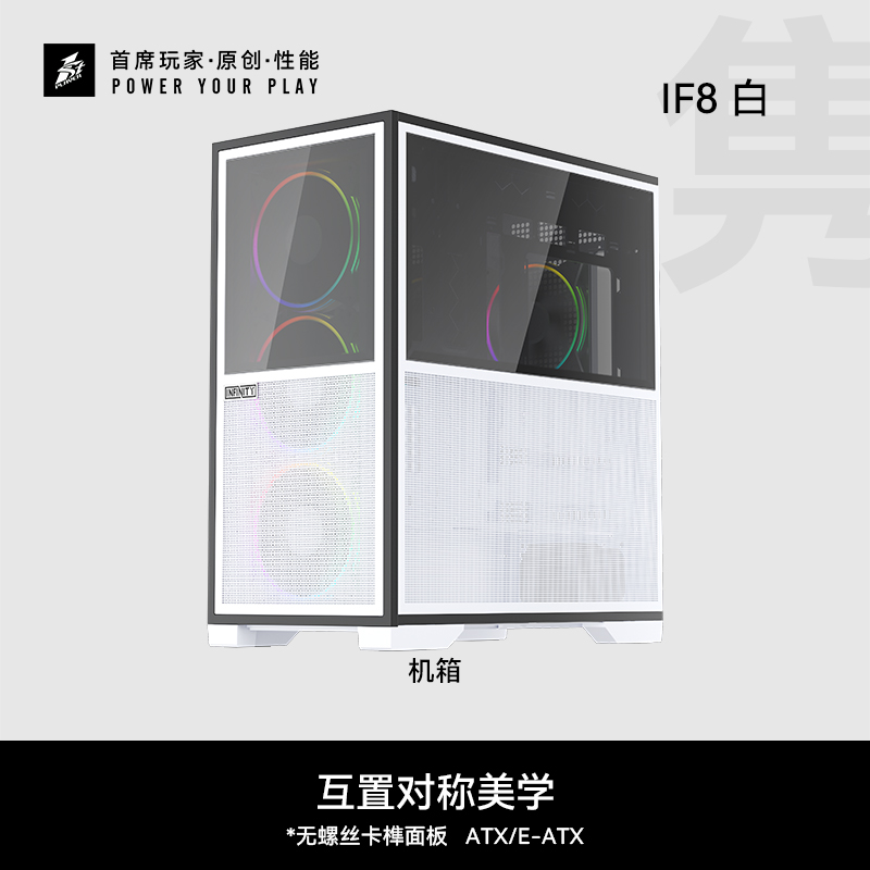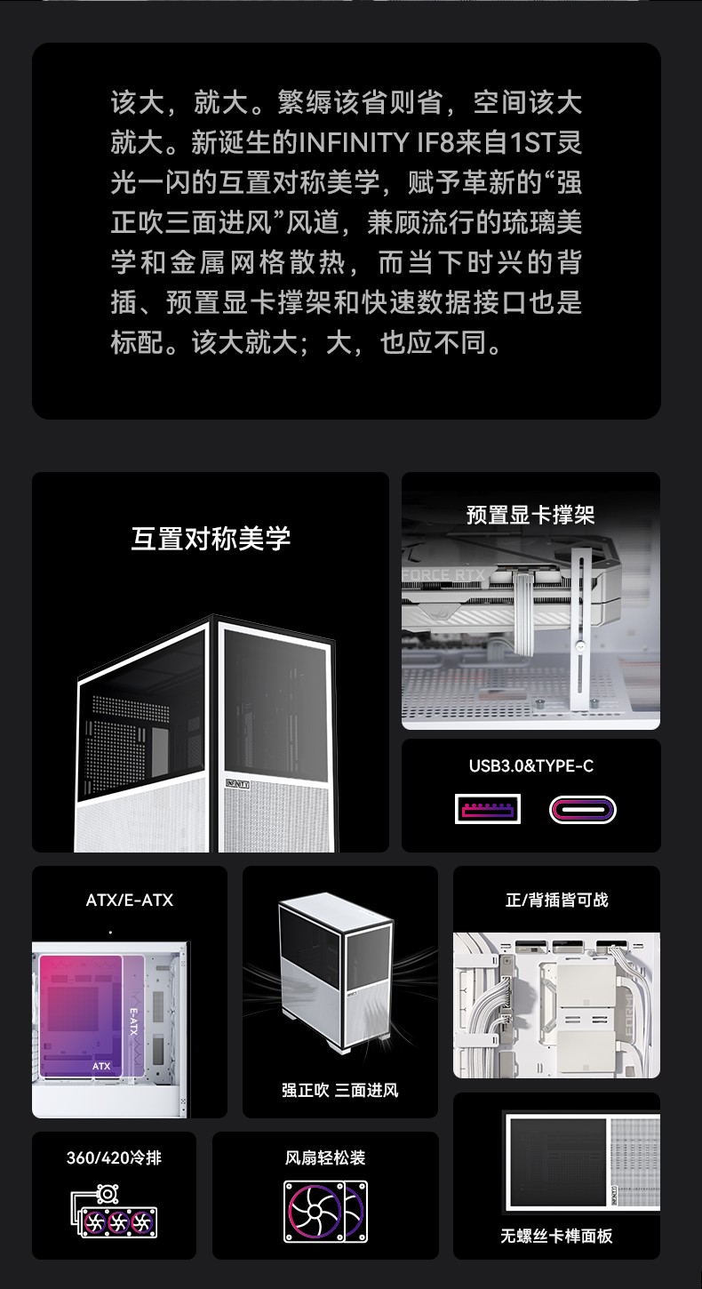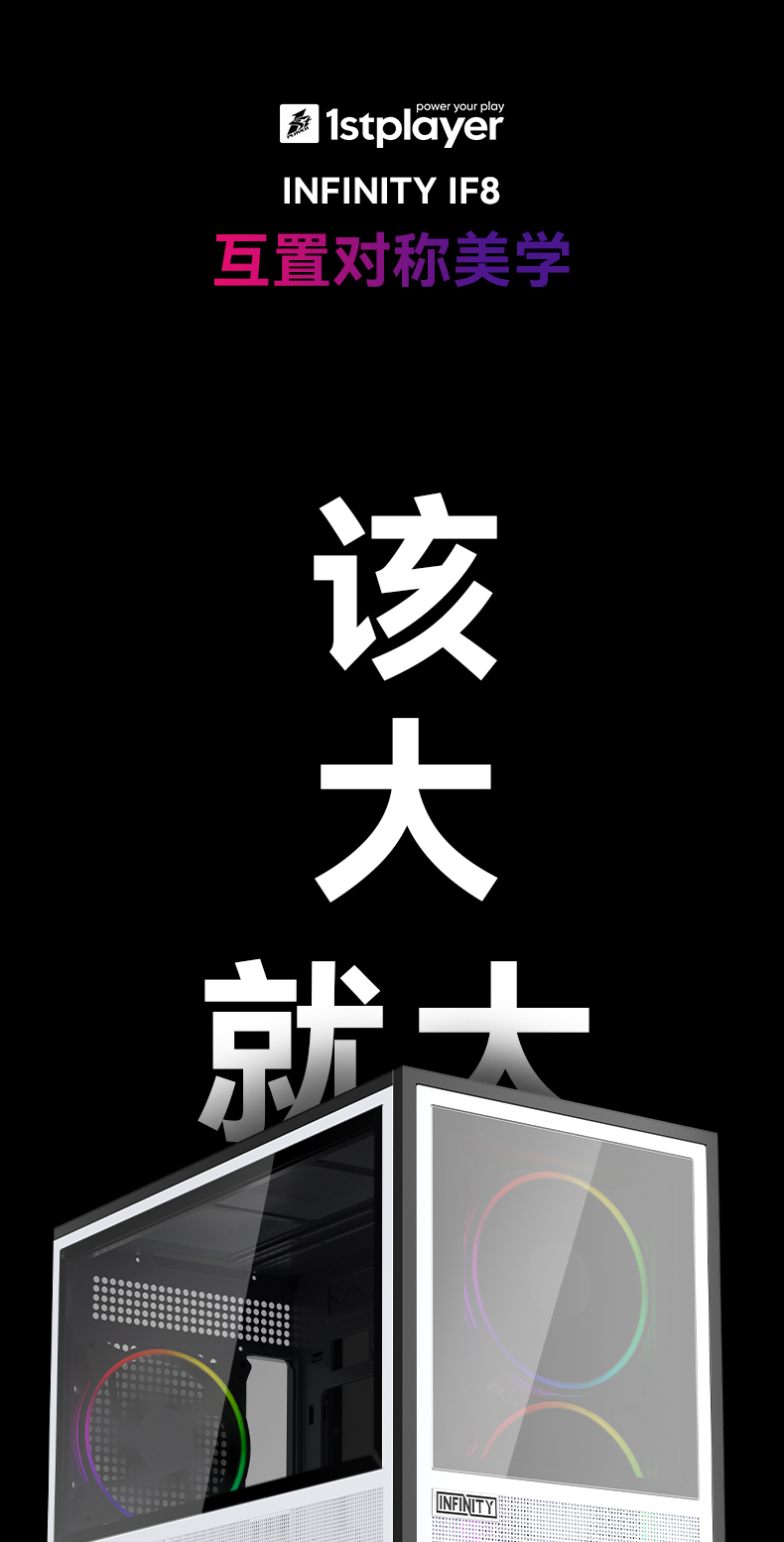 该大,就大。繁缛该省则省,空间该大就大。新诞生的INFINITY IF8来自1ST灵光一闪的互置对称美学,赋予革新的“强正吹三面进风”风道,兼顾流行的琉璃美学和金属网格散热,而当下时兴的背插、预置显卡撑架和快速数据接口也是标配。该大就大;大,也应不同。