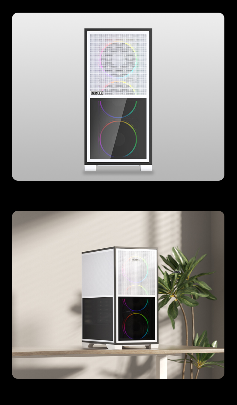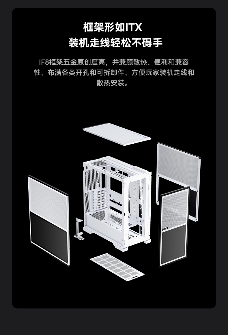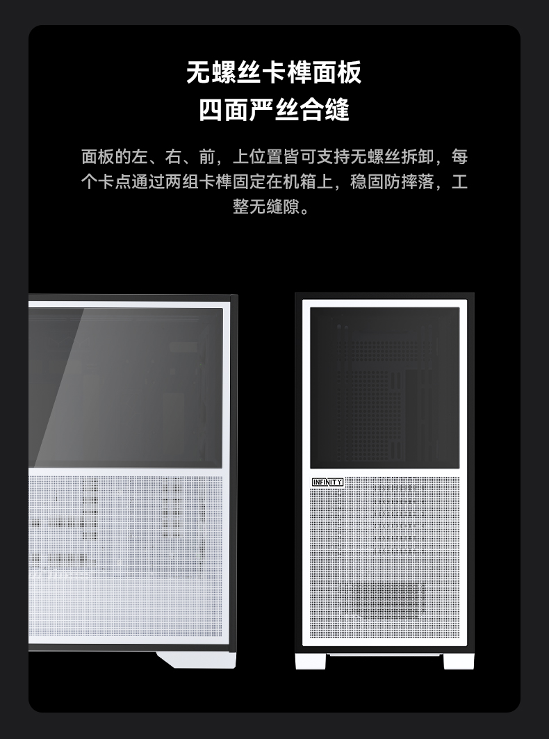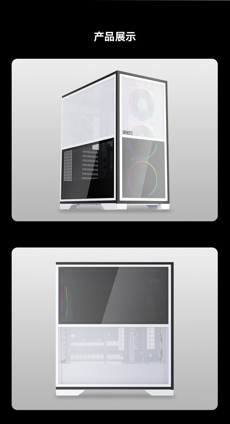 该大,就大。繁缛该省则省,空间该大就大。新诞生的INFINITY IF8来自1ST灵光一闪的互置对称美学,赋予革新的“强正吹三面进风”风道,兼顾流行的琉璃美学和金属网格散热,而当下时兴的背插、预置显卡撑架和快速数据接口也是标配。该大就大;大,也应不同。