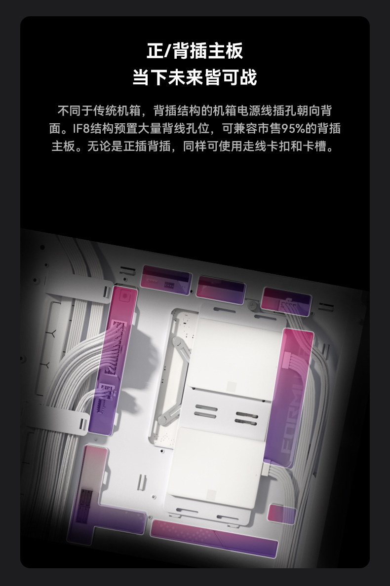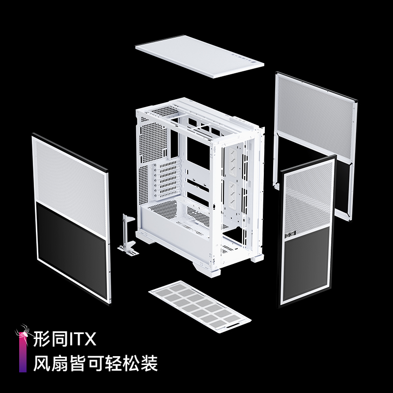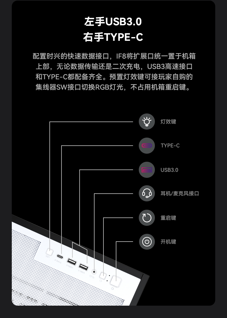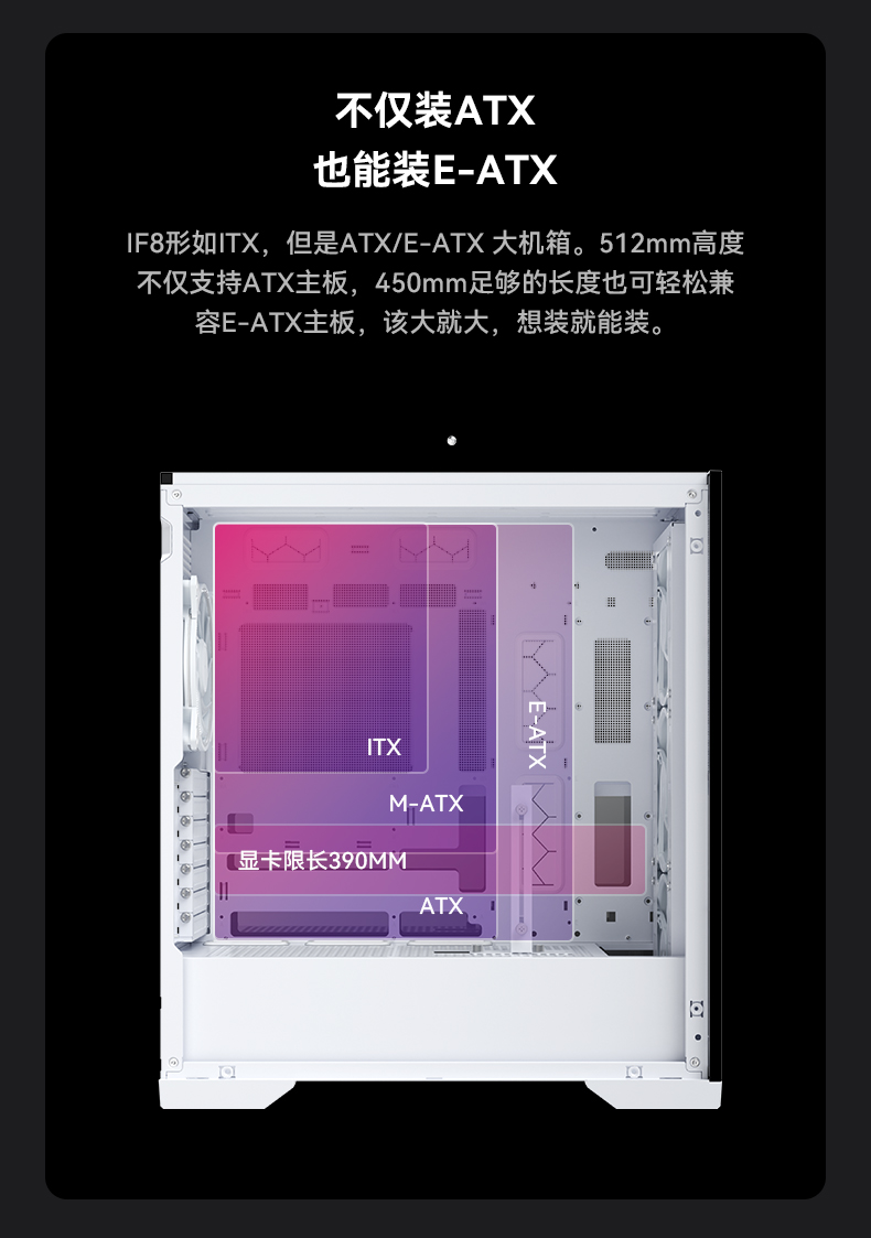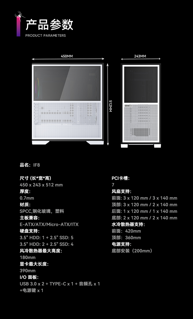 该大,就大。繁缛该省则省,空间该大就大。新诞生的INFINITY IF8来自1ST灵光一闪的互置对称美学,赋予革新的“强正吹三面进风”风道,兼顾流行的琉璃美学和金属网格散热,而当下时兴的背插、预置显卡撑架和快速数据接口也是标配。该大就大;大,也应不同。