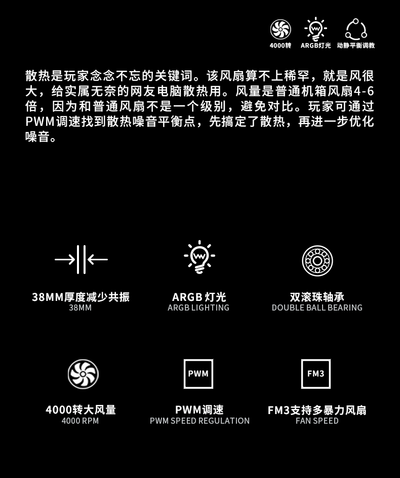 散热是玩家热衷的关键词。该风扇算不上稀罕,就是风很大,给实属无奈的网友电脑散热用。风量是普通机箱风扇4-6倍,因为和普通风扇不是一个级别,避免对比。玩家可通过PWM调速找到散热噪音平衡点,先搞定了散热,再进一步优化噪音。
