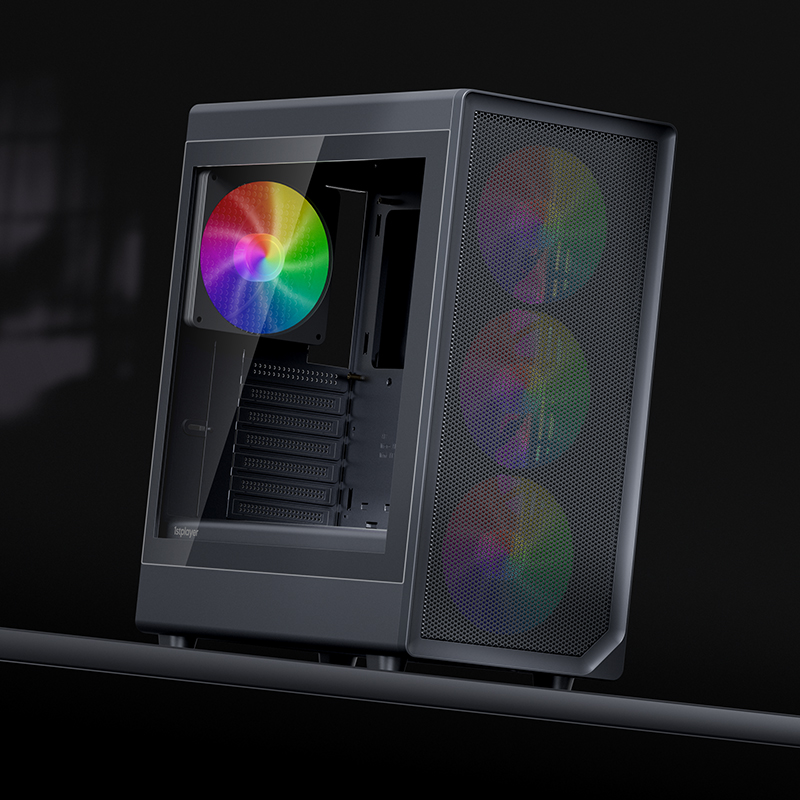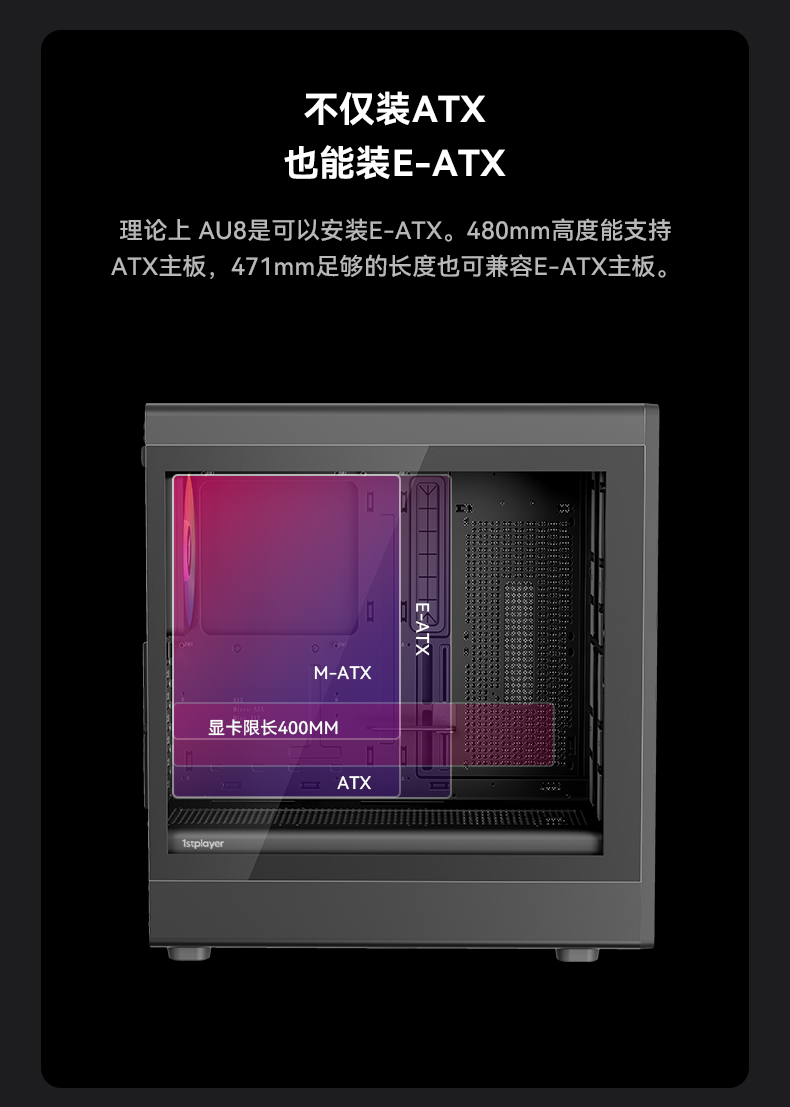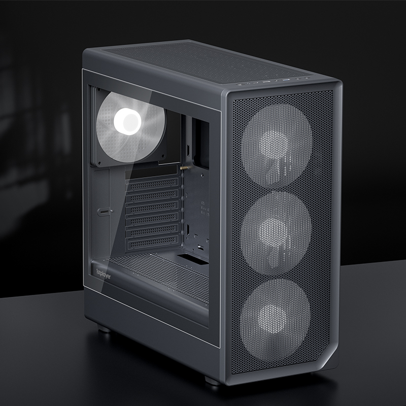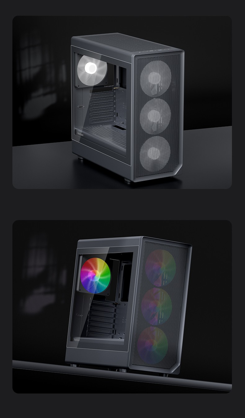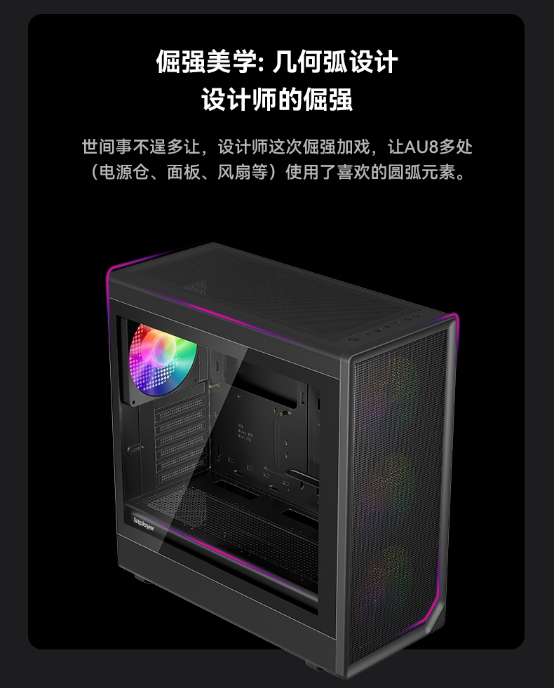 像海景房透亮,也要透气。新诞生的AURA AU8采纳1ST设计师倔强的几何弧设计,引入透气140x30MM叶环ARGB风扇,兼顾流行琉璃美学、极简金属网格和静谧体验,而当下时兴的多风扇位、预置显卡撑架和快速数据接口也是标配。该亮就亮;亮,也应透气。